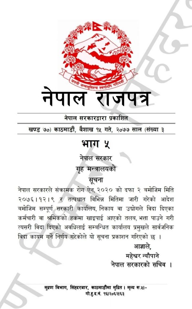 सूचनामा भनिएको छ, “मिति २०७६ चैत ९ गते र तत्पश्चात विभिन्न मितिमा जारी गरेको आदेश बमोजिम सम्पूर्ण सरकारी कार्यालय, निकाय वा उद्योगले बिदा दिएका कर्मचारी वा श्रमिकको हकमा खाइपाई आएका तलब, भत्ता पाउने गरी त्यसरी बिदा दिएको अवधिलाई सम्बन्धित कार्यालय प्रमुखले सार्वजनिक बिदा कायम गर्ने निर्णय गर्नुपर्ने हुन्छ ।”