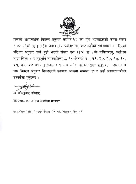 राष्ट्रिय जनस्वास्थ्य प्रयोगशाला, काठमाडौंको प्रयोगशालामा गरिएको परीक्षण अनुसार नयाँ पुष्टि भएको संख्या १० जना रहेको मन्त्रालयले विज्ञप्तिमार्फत जनाएको छ ।