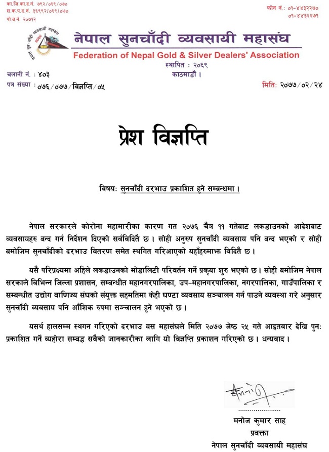 अब क्रमशः लक डाउन खुकुलो बनाउँदै जाने सरकारको नीति रहेको देखिन्छ । सोही अनुसार निश्चित समय पसल तथा उद्योगधन्दा खुल्ने क्रम सुरु भएकाले सुनको भाउ पनि तोक्न लागिएको नेपाल सुनचाँदी व्यवसायी महासंघले विज्ञप्तिमार्फत जनाएको छ ।