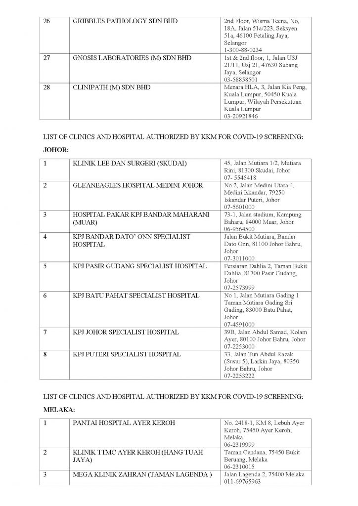 क्वालालाम्पुर र सेलाङ्गरमा कोरोना जाँच गर्नका लागि दूतावासले २८ वटा क्लिनिक तथा अस्पतालको सूची सार्वजनिक गरेको छ । यस्तै जोहर क्षेत्रका लागि आठ र मेलाका क्षेत्रका लागि तीन, नेगेरी सेम्बिलान क्षेत्रका लागि चार, पेनाङ क्षेत्रका लागि पाँच, सेर्लिस क्षेत्रका लागि क्षेत्रमा एक, पेराक क्षेत्रमा चार, सभा क्षेत्रमा चार र सारवाक क्षेत्रमा चार वटा कोरोना जाँचका लागि क्लिनिक तथा अस्पतालहरु तोकिएको छ । यसबाहेक आफूलाई पायक पर्ने ठाउँमा पनि जाँच गराउन सकिन्छ ।