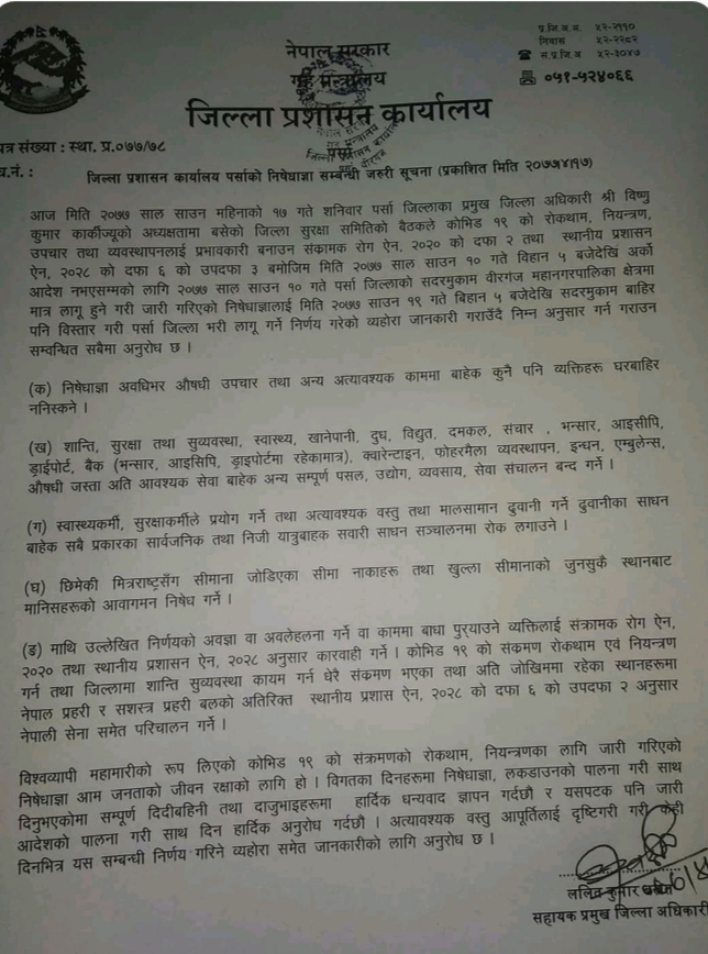 यसअघि गएको १० साउनबाट वीरगन्ज महानगरपालिकामा मात्र लागू हुने गरी अर्को सूचना जारी नहुञ्जेलसम्म निषेधाज्ञा जारी भएको थियो । पर्सामा आज मात्रै दुई महिलाको कोरोनाबाट मृत्यु भएको छ ।