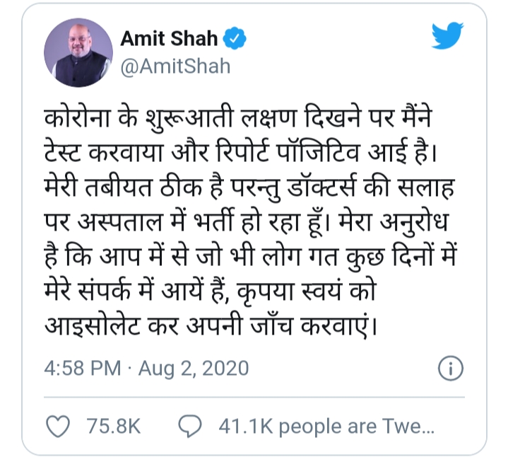 गृहमन्त्री शाहले आफै यसबारे पुष्टी गरेका छन् । आइतबार दिउँसो उनले आफ्नो ट्वीटर अकाउन्टमा आफुलाई कोरोना संक्रमण भएको उल्लेख गरेका छन् ।