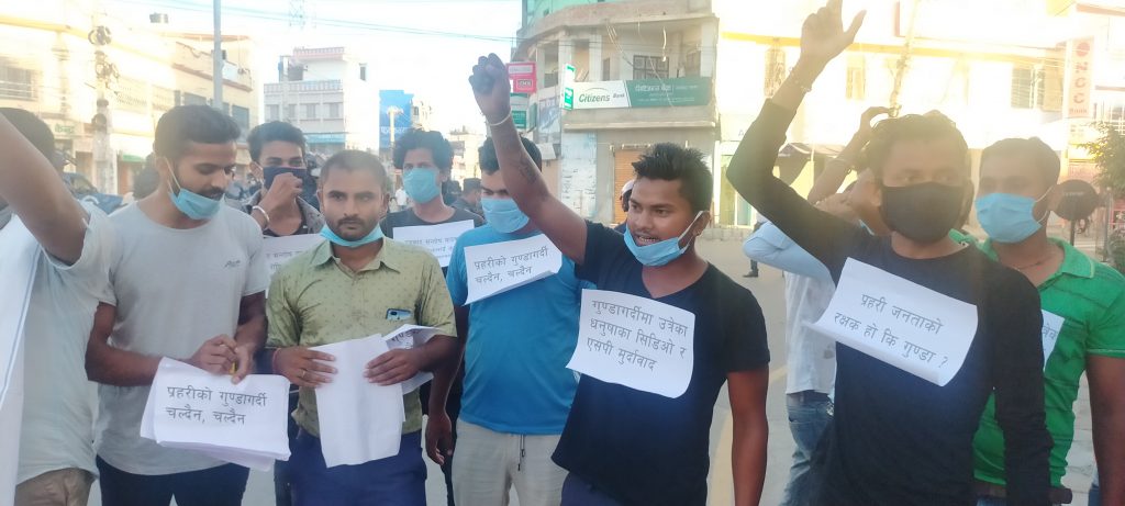 प्रेस स्वतन्त्रता कायम गर, पत्रकार कुट्ने गुण्डा प्रहरीलाई कारबाही गर, गुण्डागर्दी बन्द जस्ता जस्ता नारा लेखिएको प्लेकार्ड बोकेर यूवाहरुले प्रशासन विरुद्ध नाराबाजी समेत गरे । उनीहरुले हिजो पनि प्रशासनविरुद्ध प्रदर्शन गरेको थियो ।