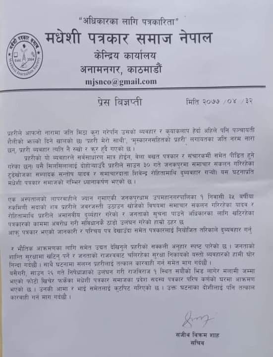 समाजका सचिव संजीव विक्रम साहले विज्ञप्ती जारी गरे पत्रकार कुटपिट घटनाप्रति गम्भिर ध्यानाकर्षण भएको भन्दै घटनामा संलग्नलार्ई कारबाही गर्न माग गरेको हो । आफु पत्रकार भएको र परिपत्र देखाउँदा समेत पत्रकारलाई नियोजित तरिकाले दुव्र्यवहार र भौतिक आक्रमणका लागि समेत उद्यत देखिनुले प्रहरीको सक्कली अनुहार स्पष्ट भएको विज्ञप्तीमा भनिएको छ ।