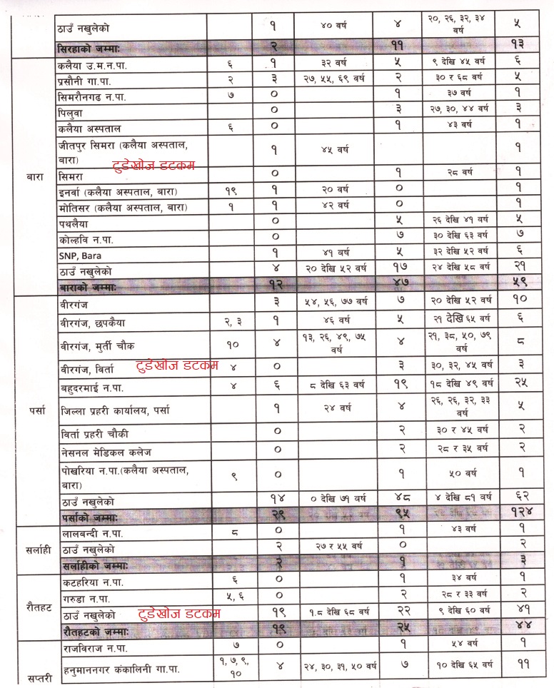 सामाजिक विकास मन्त्रालय प्रदेश २ का वरिष्ठ चिकित्सक कमलेश प्रसाद यादवका अनुसार पर्सामा सबैभन्दा बढी १ सय २४ जनामा कोरोना संक्रमण पुष्टि भएको छ । यस्तै बारामा ५९, धनुषामा ५४, रौतहटमा ४४, सप्तरीमा १४, महोत्तरी र सिरहामा १३/१३ जना संक्रमित थपिएका हुन् । सर्लाहीमा आज मात्र ३ जनामा कोरोना पुष्टि भएको छ।