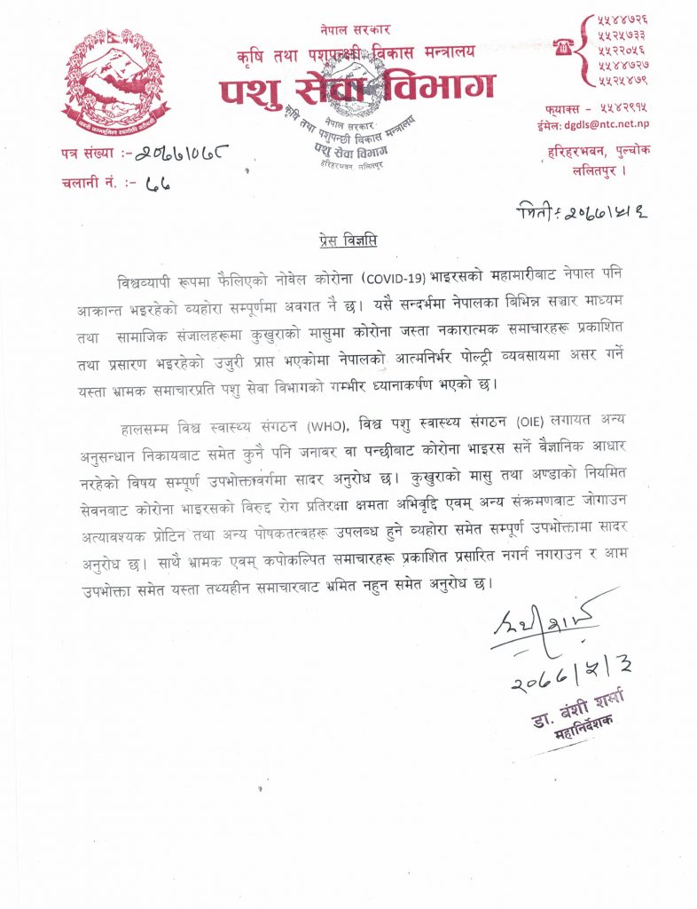 कुखुराको मासु र अण्डाको नियमित सेवन गरेमा कोरोना भाइरसविरुद्ध लड्न सक्ने रोग प्रतिरक्षा क्षमता बढाउने भन्दै विभागले यस्ता अफवाहको पछि नलाग्न सबैमा अपिल गरेको छ । केही केही सञ्चारमाध्यम र सामाजिक सञ्जालमा कुखुराको मासुमा कोरोना भन्ने नकारात्मक समाचार समाचारहरु प्रकाशित र प्रशारण भएको भन्दै विभागले पोल्ट्री व्यवसायमा असर गर्ने यस्ता भ्रामक समाचारको पछि नलाग्न पनि भनेको छ ।