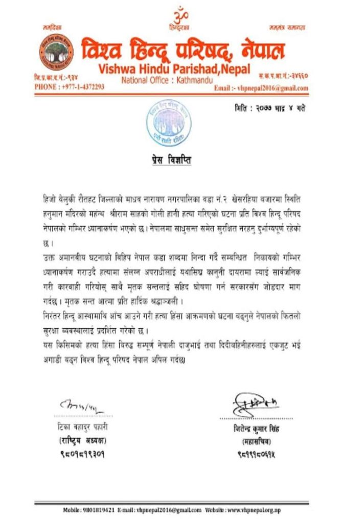 ‘नेपालमा साधुसन्त समेत सुरक्षित हुन नसक्नु दुर्भाग्यपुर्ण छ,’ विज्ञप्तीमा भनिएको छ, ‘निरन्तर हिन्दु आस्थामाथि आँच आउने गरी हत्या, हिंसा, आक्रमणको घटना बढ्नुले नेपालको फितलो सुरक्षा व्यवस्थालाई प्रदर्शित गरेको छ ।’