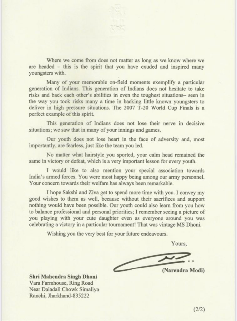 भारतका प्रधानमन्त्री नरेन्द्र मोदीले हालै अन्तर्राष्ट्रिय क्रिकेटबाट संन्यास लिएका पूर्वकप्तान महेन्द्रसिंह धोनीलाई चिट्ठी पठाएका छन् ।