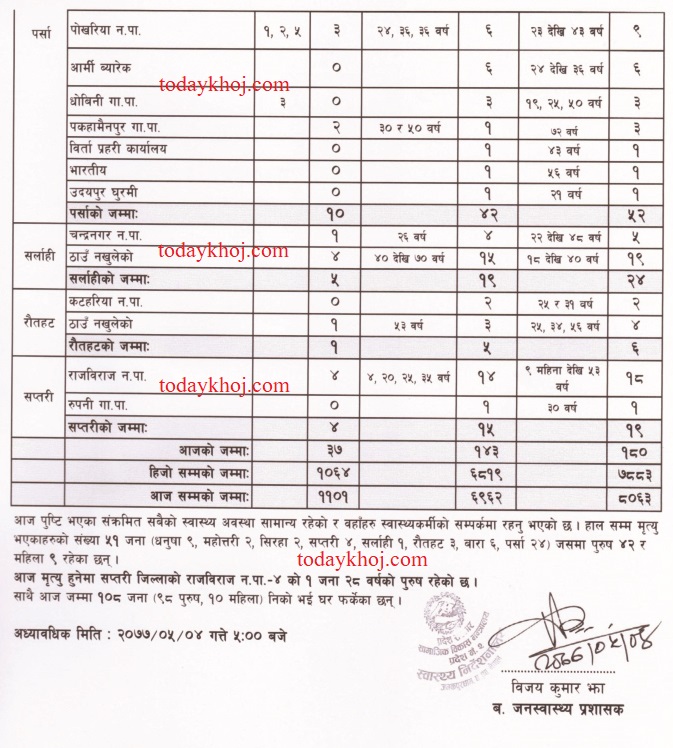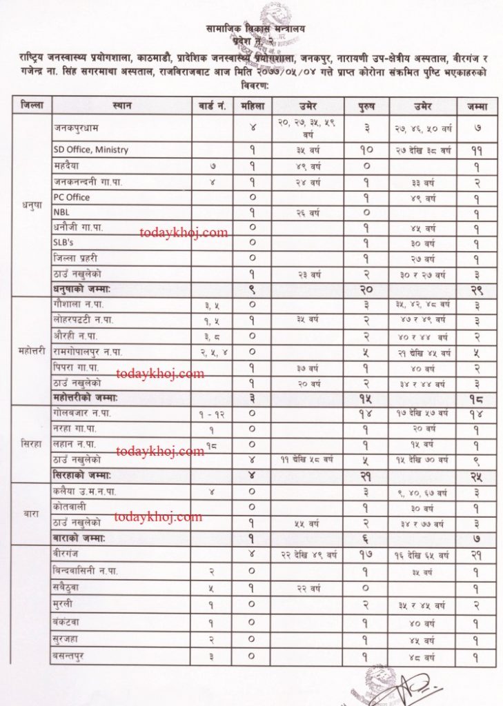 उनका अनुसार पछिल्लो २४ घण्टामा सबभन्दा बढी पर्सामा ५२ जनामा कोरोना पुष्टि भएको छ । यस्तै धनुषामा २९ जना, महोत्तरीमा १८ जना, सिरहामा ९ जना, बारामा २१ जना, सर्लाहीमा २४ जना, रौतहटमा ६ जना र सप्तरीमा १९ जना संक्रमित थपिएका छन् ।