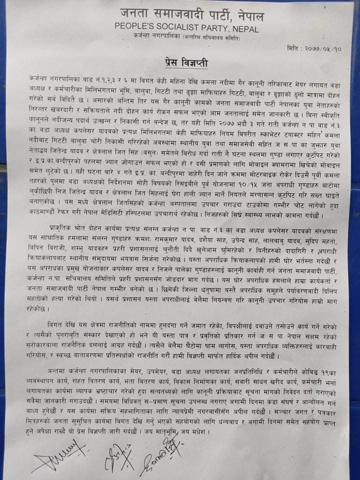 ढुङ्गा उत्खननको विरोध गर्दा जितेन्द्र यादब र क्षेत्रलालजित सिंहमाथि गरिएको आक्रमणकारीलाई कारबाही नगरेको भन्दै जनता समाजवादी पार्टीले विज्ञप्ती जारी गरेर यस्तो आरोप लगाएको हो । नदी उत्खनन गर्ने र उनीहरुलाई संरक्षण गर्ने जनप्रतिनिधिलाई सम्बन्धित निकायले कारबाही नगरेको बताइएको छ ।