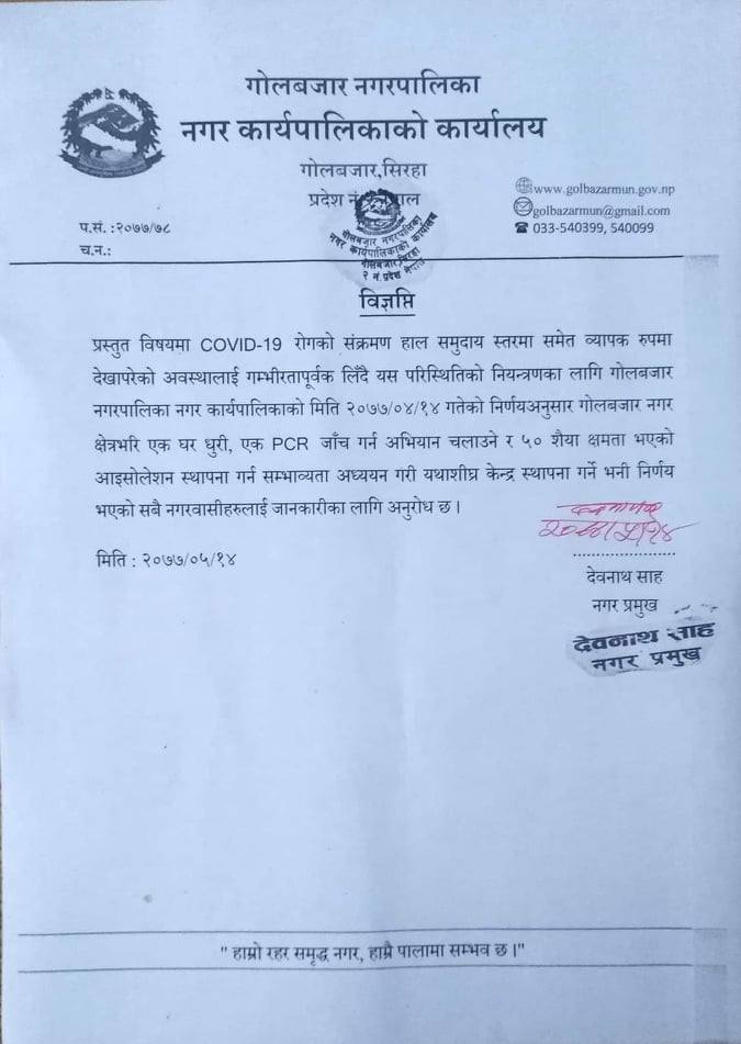 जयनाथ यादब / लहान : सिरहाको गोलबजार नगरपालिकाले एक घर, एक पिसिआर (PCR) टेस्ट गर्ने निर्णय गरेको छ । आईतवार बसेको नगर कार्यपालिकाको बैठकले यस्तो निर्णय गरेको हो ।