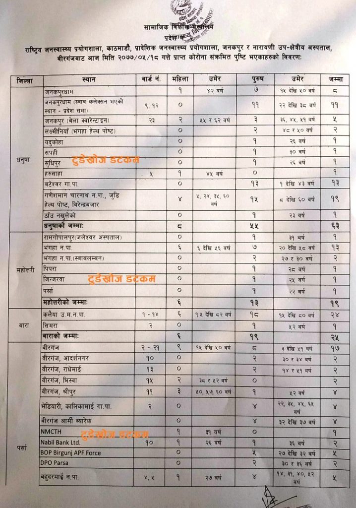 सामाजिक विकास मन्त्रालयका अनुसार सबभन्दा बढी पर्सामा ६९ जना संक्रमित थपिएका छन् । यस्तै धनुषामा ६३ जना, महोत्तरीमा १९ जना, बारामा २५ जना, सर्लाहीमा ३० जना र रौतहटमा ४६ जना संक्रमित थपिएका हुन् ।