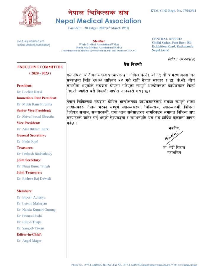 आमरण अनसनमा बसेका डा. गोबिन्द केसी र सरकारबीच मध्यरातमा ८ बुंदे सम्झौता भएपछि संघले अस्पताल बन्दको आन्दोलन फिर्ता लिएको हो । डा. केसीसँग सरकारले २७ औँ दिन सम्झौता गरेको छ ।