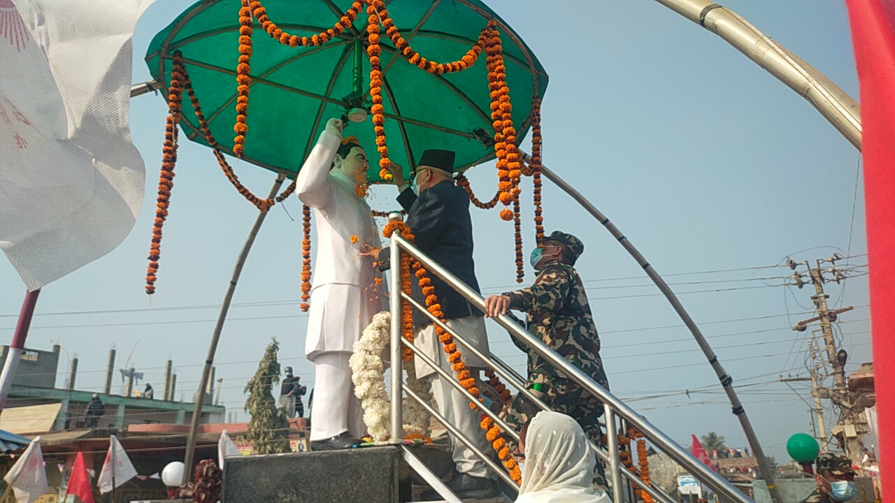 सिरहा : प्रधानमन्त्री ओलीद्वारा स्वर्गिय हेमनारायणको शालिकमा माल्यार्पण