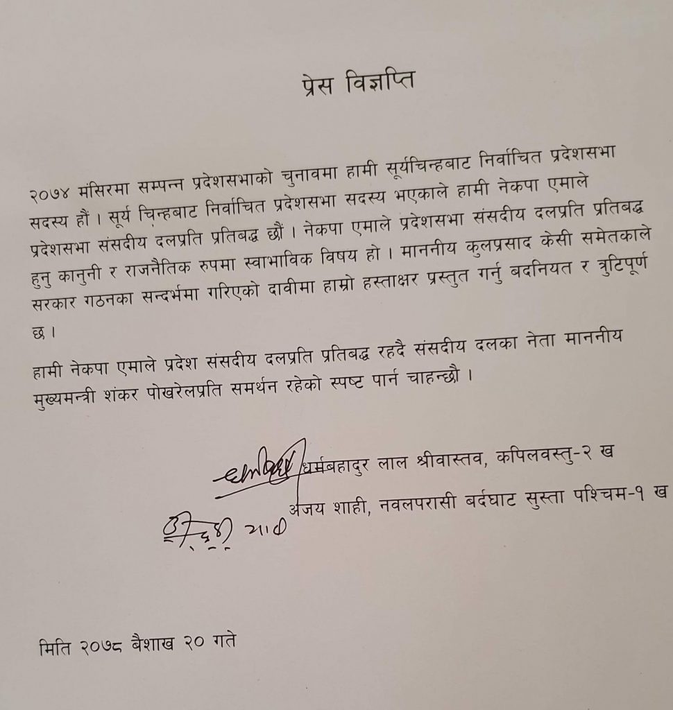उनी दुवै साँसद आज संयुक्त विज्ञप्ति निकाल्दैं आफूहरूको समर्थन मुख्यमन्त्री शंकर पोखरेललाई रहेको प्रष्ट पारेका छन् । आइतबार यी दुई सांसदले माओवादी केन्द्रका कुलप्रसाद केसीलाई मुख्यमन्त्री बनाउनुपर्ने पक्षमा उभिएका थिए ।