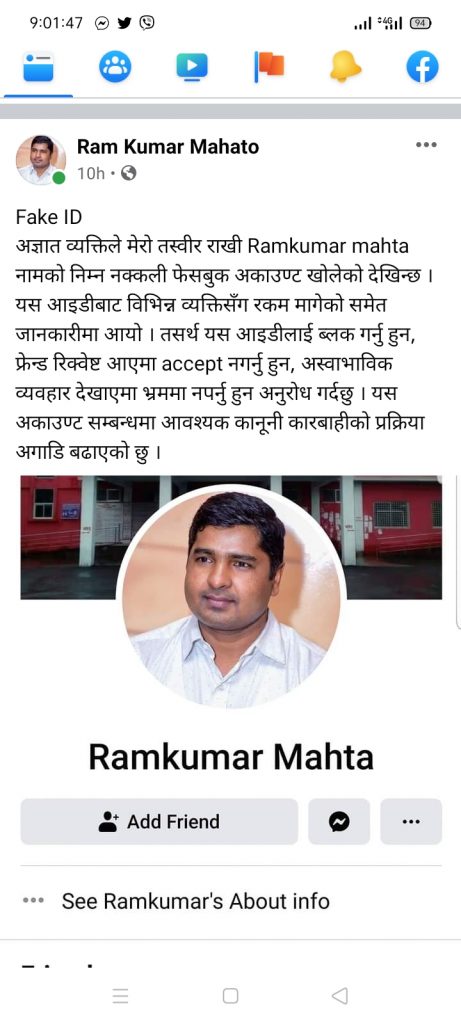 सिडिओ महतोले आफ्नो फेसबुकमा स्टाटस लेखेर सो कुराको जानकारी गराएका हुन् । उनले आफ्नो तस्विर राखेर अज्ञात व्यक्तिले नक्कली फेसबुक अकाउन्ट खोलेको र उक्त आइडीबाट विभिन्न व्यक्तिसँग रकम मागेको समेत जानकारीमा आएको बताएका छन् ।