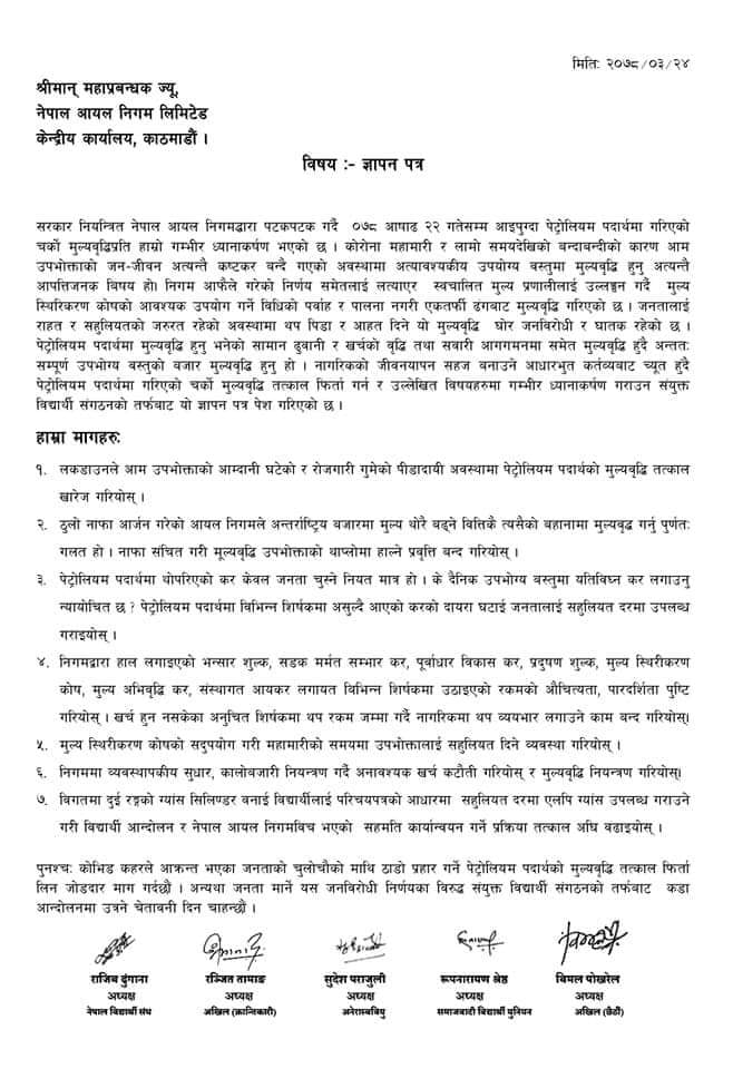 काठमाडौं : विपक्षी गठबन्धनसम्वद्ध पाँच विद्यार्थी संगठनले पेट्रोलियम पदार्थको मूल्य वृद्धि फिर्ता लिन माग गरेका छन् ।नेपाल आयल निगमको कार्यालयमा उनीहरूले मूल्य वृद्धि फिर्ता नलिए कडा आन्दोलमा उत्रने चेतावानीसमेत दिए ।