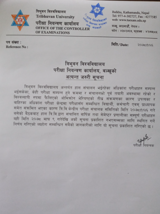 त्रि.वि. केन्द्रीय परीक्षा संचालक समितिको आजको बैठकले सम्पन्न हुने क्रममा र संचालनको पूर्वतयारी अवस्थामा रहेका परीक्षाहरू कोरोना संक्रमणको बढ्दो जोखिमका कारण माघ ९ देखि अनिश्चितकालका लागि स्थगित गर्ने निर्णय गरेको हो ।