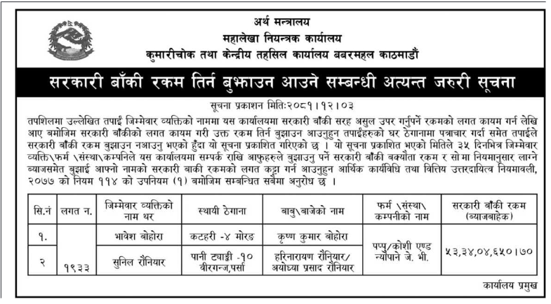 काठमाडौं । निर्माण कम्पनी पप्पु कन्ट्रक्सन/कोसी एन्ड न्यौपाने जेभीले सरकारलाई बुझाउनुपर्ने ५३ करोडभन्दा बढी रकम अहिलेसम्म नदिएपछि महालेखा नियन्त्रक कार्यालयले ३५ दिने सूचना निकालेको छ ।