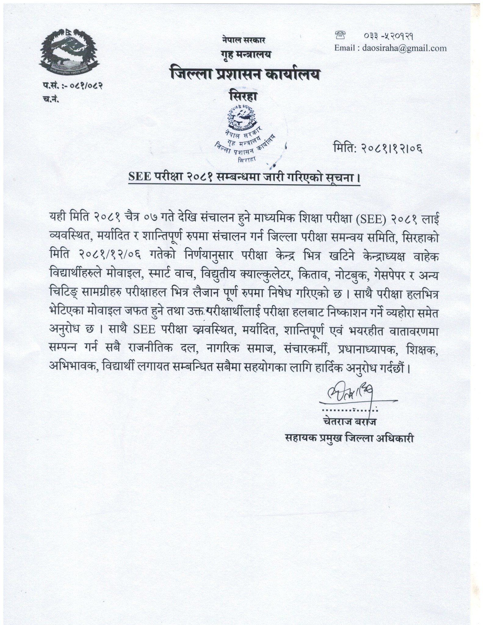 सिरहा । जिल्ला प्रशासन कार्यालय सिरहाले भोली बुधवारबाट सुरु हुन लागेको माध्यमिक शिक्षा परीक्षा (एसइई)लाई मर्यादित, व्यवस्थित, शान्तिपूर्ण एवं भयरहीत बनाउन सरोकारवाला निकायसँग आग्रह गरेको छ ।